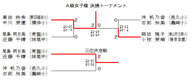 | 岡田 雅子 (津山市立南小) 小枝 茉瑚 (柵原学園) | ○ 21-13 21- 9 | ○ 21-14 17-21 21-16 | ○ 19-21 21-18 21- 9 | 1 | |