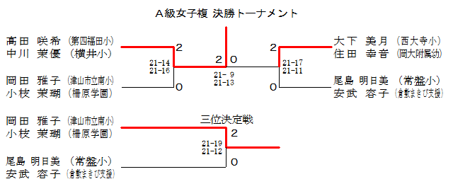 | 尾島 明日美 (常盤小) 安武 容子 (倉敷まきび支援) | ○ 13-21 21-16 21-18 | ○ 21-10 21- 3 | 1 |